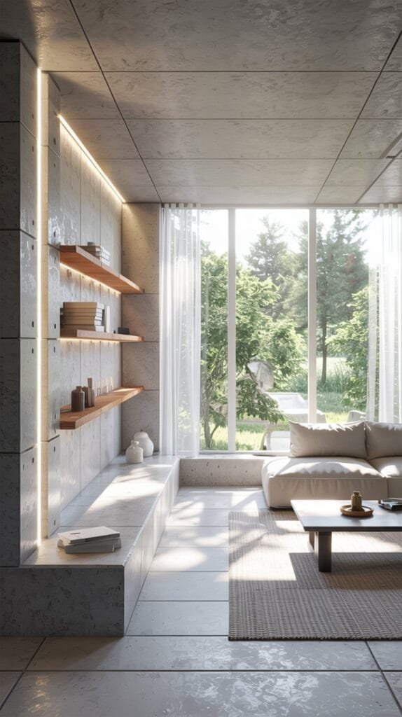 Use subtle wallpaper with a linen or plaster texture effect to add depth without distracting from the minimalist theme. Earthy wallpaper pairs beautifully with wood and stone.