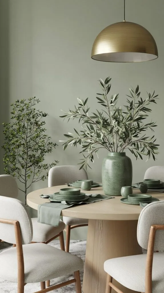Layer greens intentionally. A matte green ceramic vase filled with eucalyptus, a sage linen runner, and a stack of stoneware plates in shifting green tones create depth. Add a brushed brass dome pendant for warmth and a small olive tree in the corner for life.