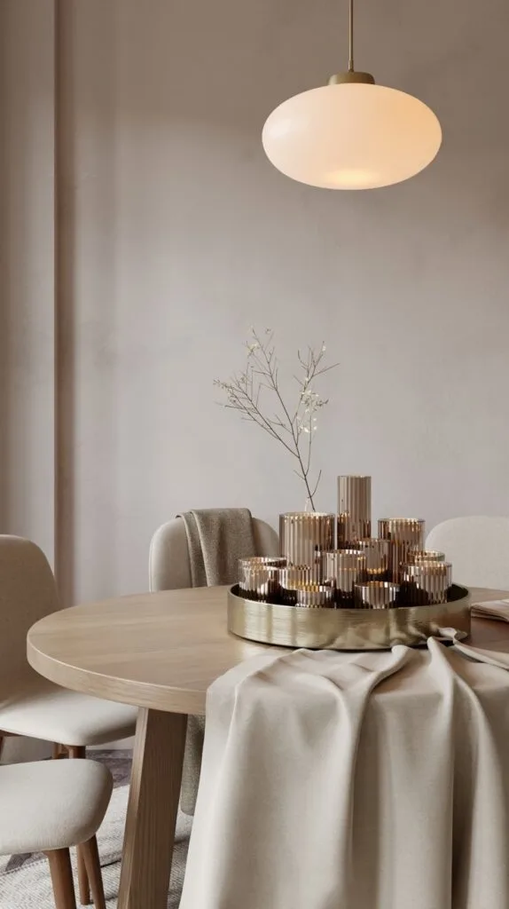 For a festive touch that still feels minimalist, layer soft neutrals with delicate metallics. Choose a light oak round table with cream upholstered chairs. Walls in pale mushroom set a gentle backdrop.