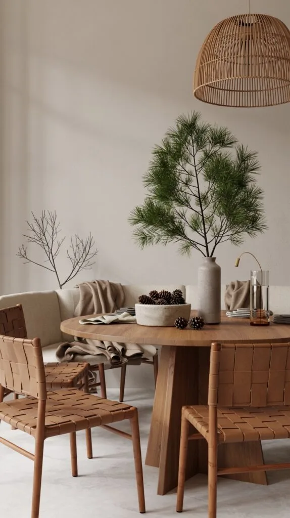 Think mountain chalet, but pared back. Choose a solid oak dining table with rounded corners and pair it with camel leather sling chairs. Keep the walls warm but subtle—try greige or a pale stone tone.