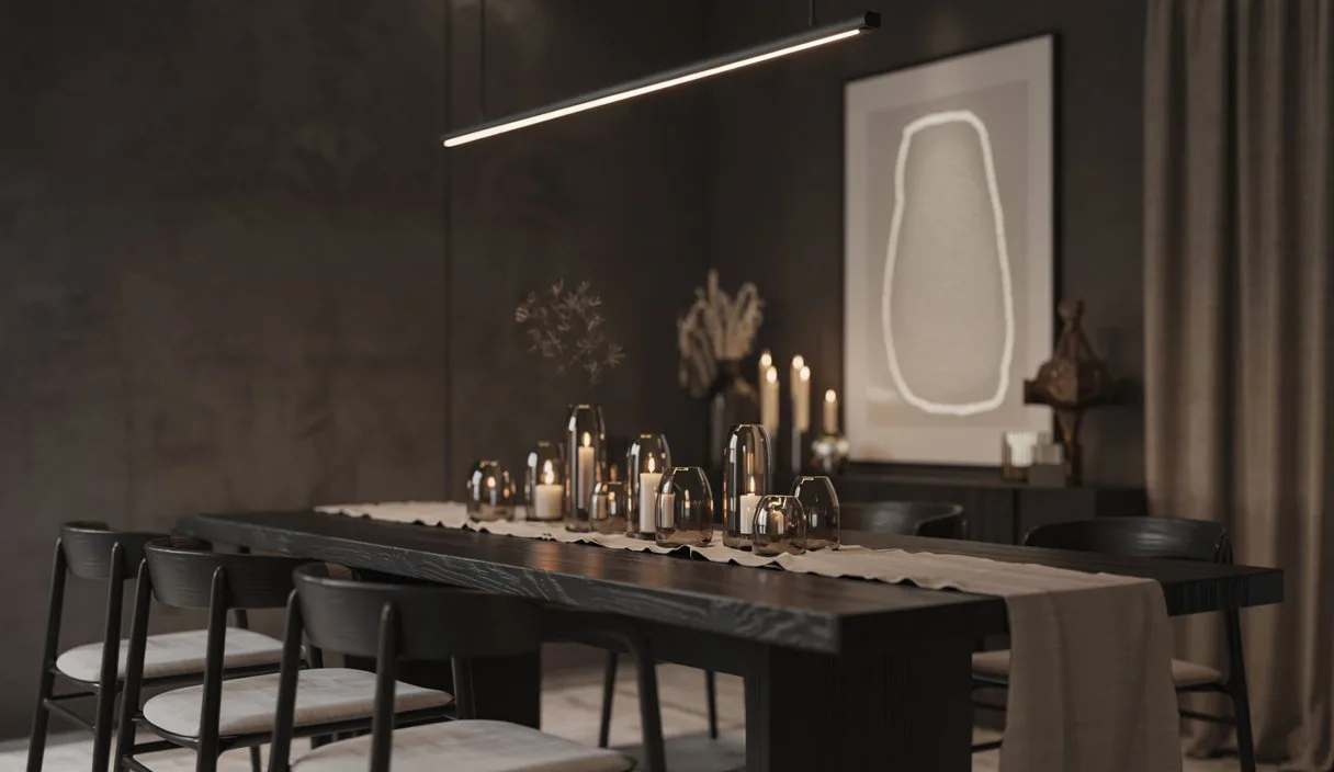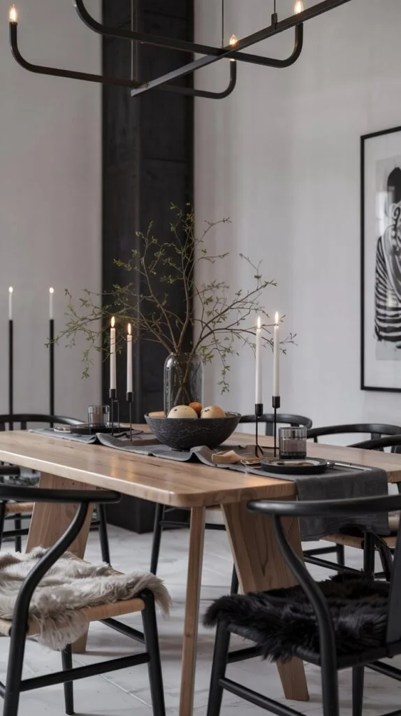 Style the table with a charcoal linen runner, a black stone bowl, and a few beeswax taper candles in matte black holders. Overhead, a black linear chandelier sharpens the silhouette. A shearling seat pad or two keeps things cozy and seasonal.