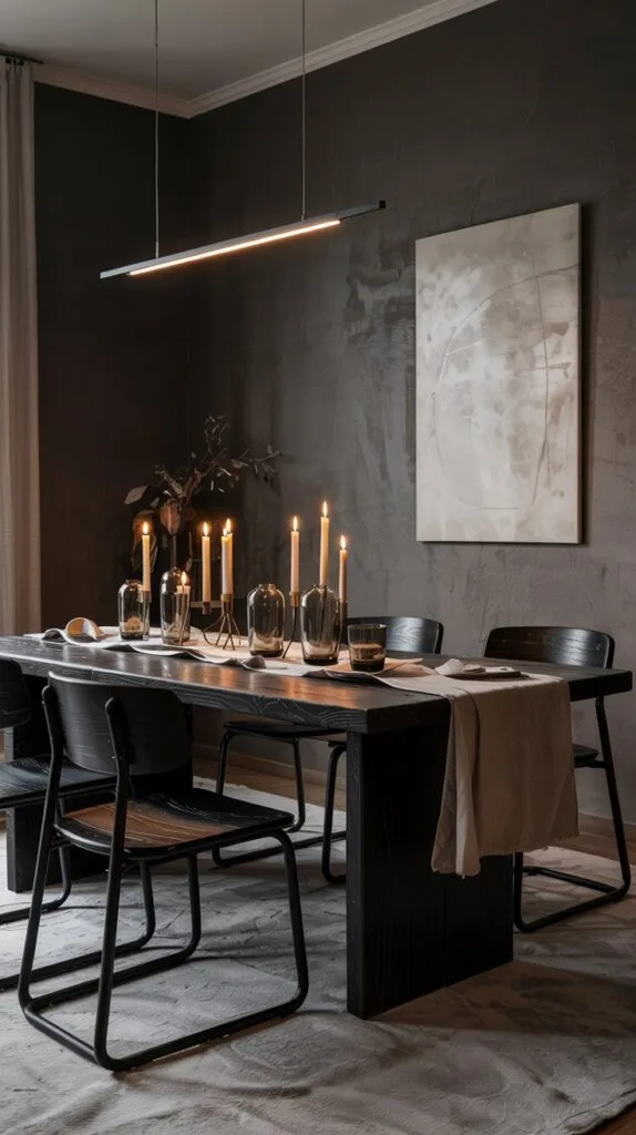 If you love drama, go moody. Paint the walls a soft charcoal gray or deep graphite, then contrast with a black-stained rectangular table and slim steel-framed chairs. The shapes stay simple, so the color does the talking.