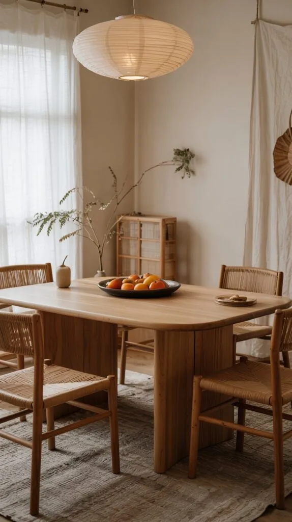 Center the table with a shallow clay bowl of pears or persimmons for subtle color. Hang a simple rice paper lantern overhead for gentle light. Add a flatweave wool rug and a petite shoji-style room divider if you need visual separation without heaviness.