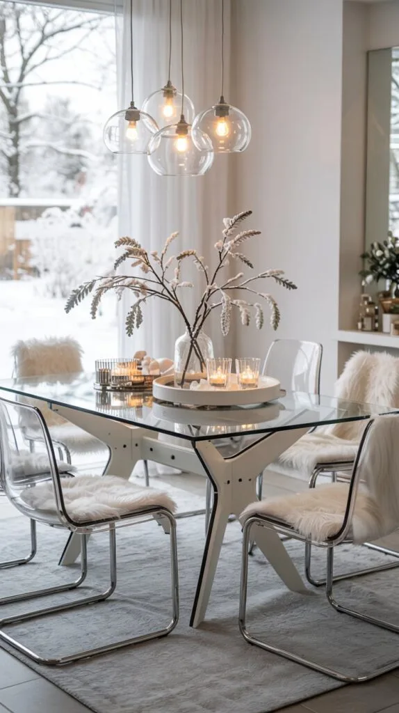 For winter charm, set out a low white ceramic tray with scattered mercury glass tealights and a few snowy faux berries. Above, install a cluster of small glass pendants for sparkle without visual weight. Finish with a pale gray wool rug to anchor the transparency.