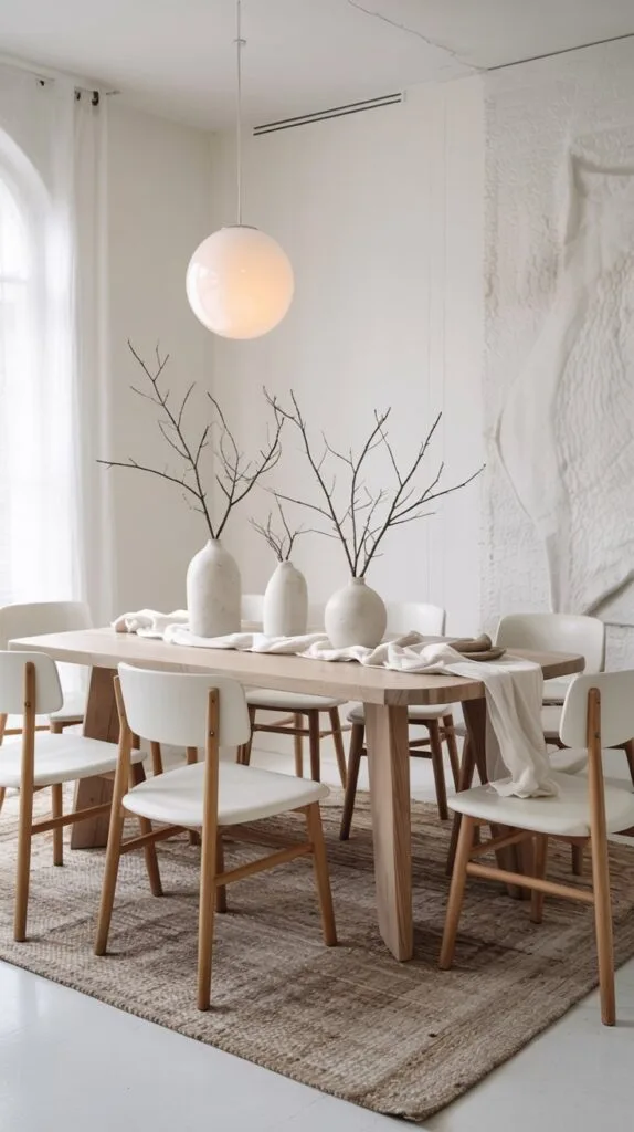 Layer in texture so it doesn’t feel flat. A chunky ivory wool runner draped down the center brings warmth, while a cluster of white ceramic bud vases with bare branches adds height. Hang a frosted glass globe pendant overhead for a soft, diffuse glow, and ground everything with a flatweave jute rug to keep the white from feeling too cold.