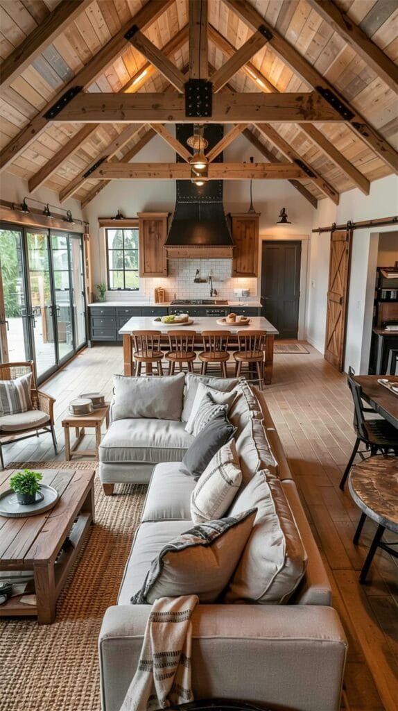 If you’re drawn to Modern Barndominium Ideas, the open floor plan is your best friend. Tear down walls (real or metaphorical) and let your kitchen, dining, and lounge zones flow effortlessly together. This creates a sense of scale that’s downright cinematic.