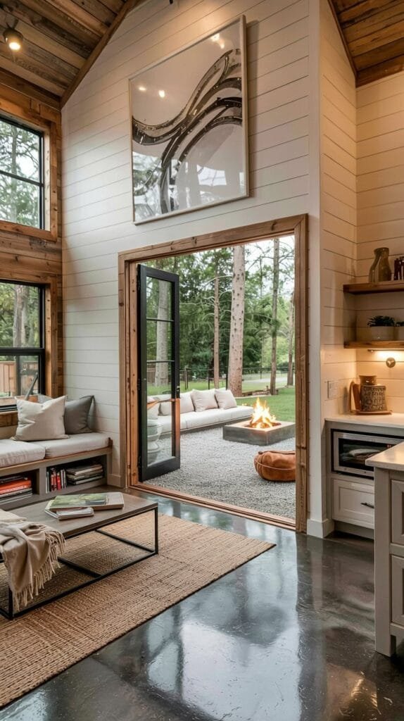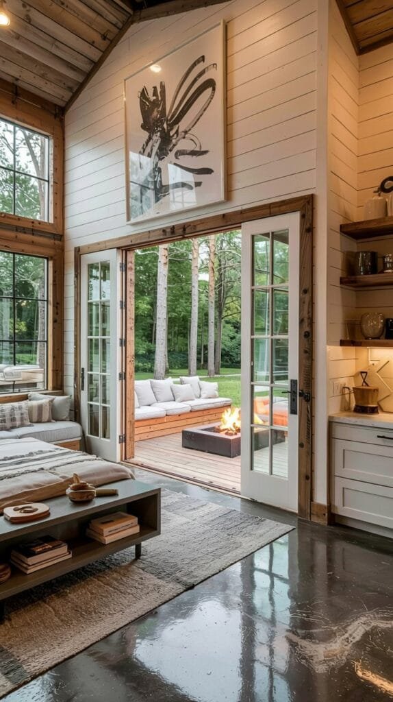 Try polished concrete floors paired with crisp shiplap walls, or swap in large-scale artwork to create drama. A fire pit just outside the French doors is a total game-changer—especially when paired with a few low-slung loungers you can grab on Amazon.
