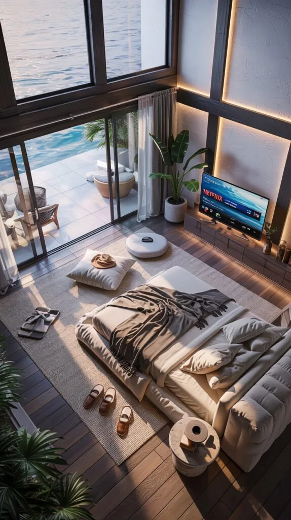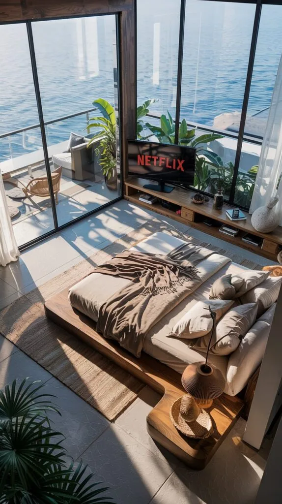 Nothing beats a living room designed around the view. I love using natural stone walls, timber accents, and low-profile furniture to keep the eye drawn outside.