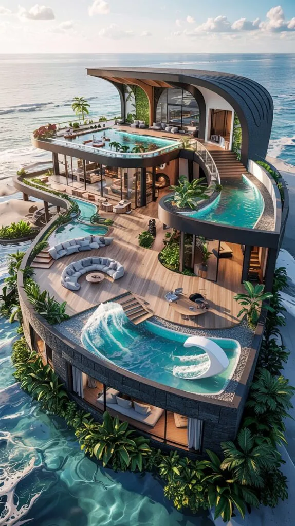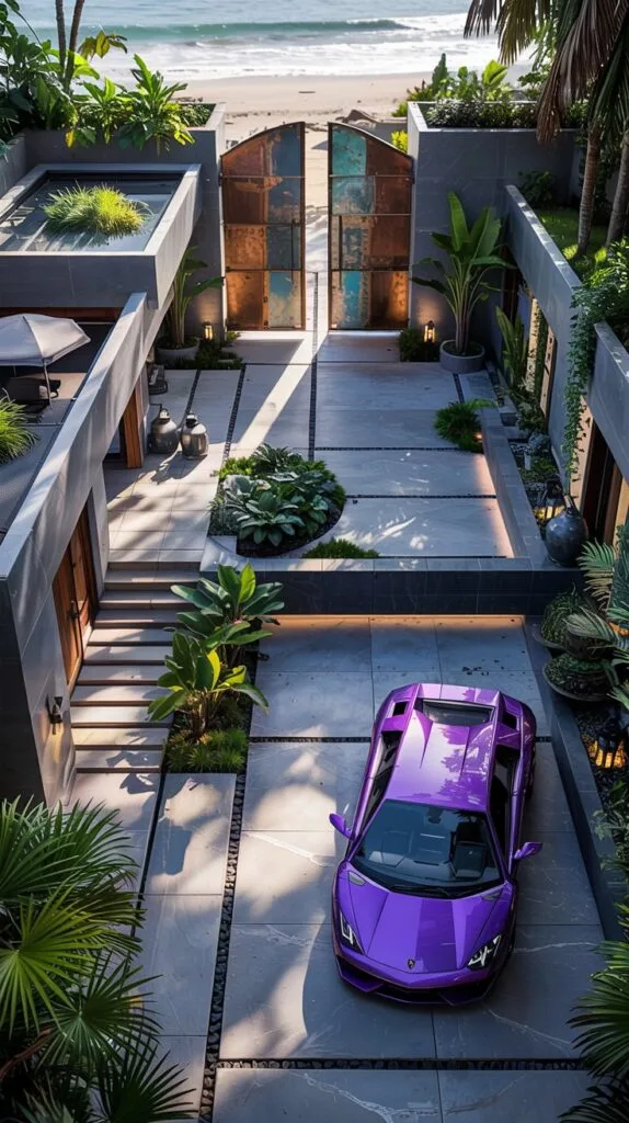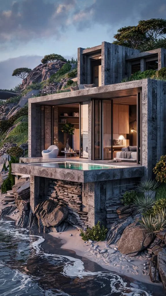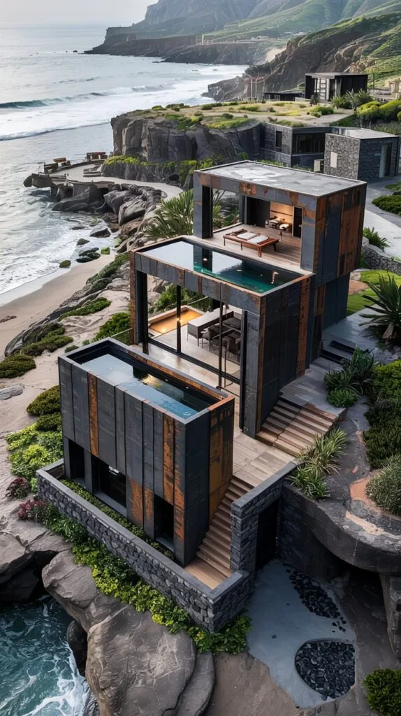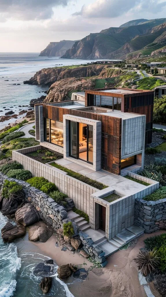 Think monolithic forms and clean lines that feel almost carved from the coastline itself. Concrete walls, oversized pivot doors, and steel accents make the architecture the star.
