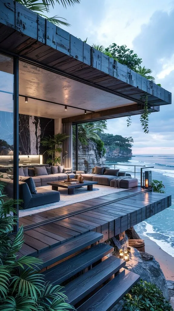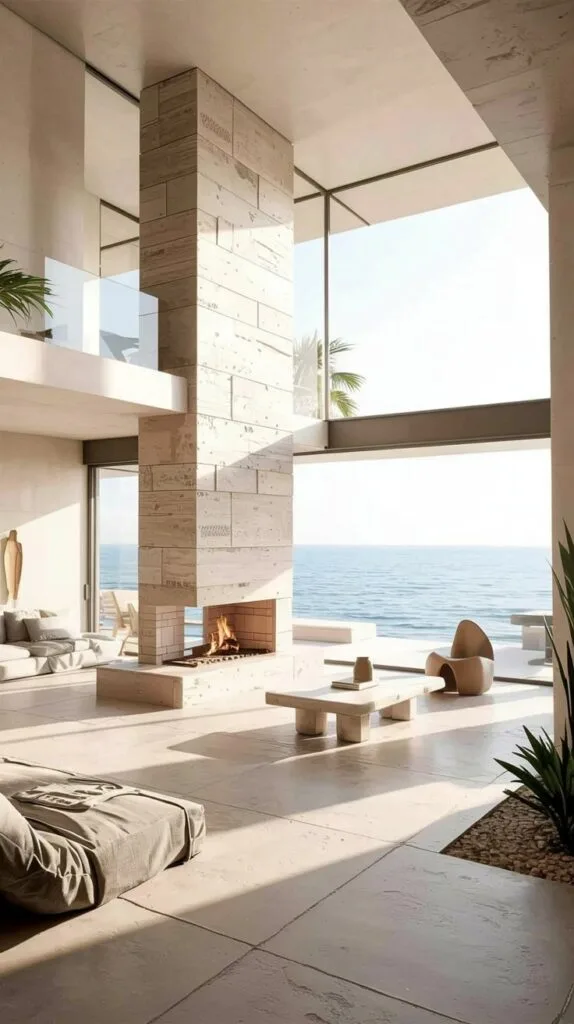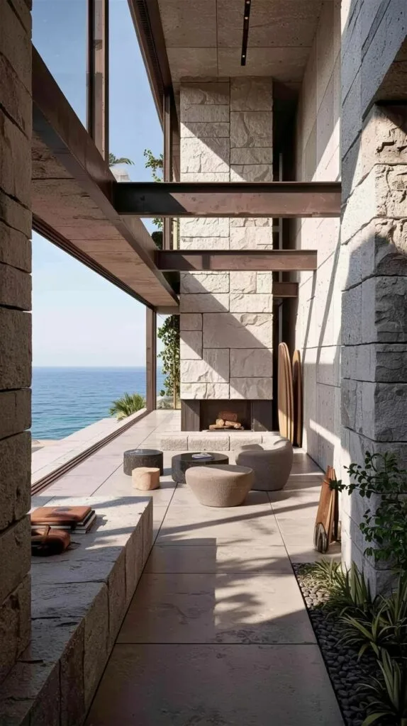I’m obsessed with how a single wooden bench or a raw stone fireplace can completely soften a modern beach house interior.