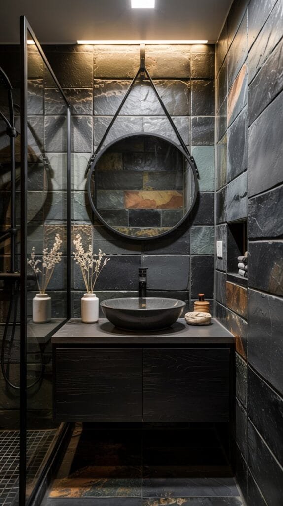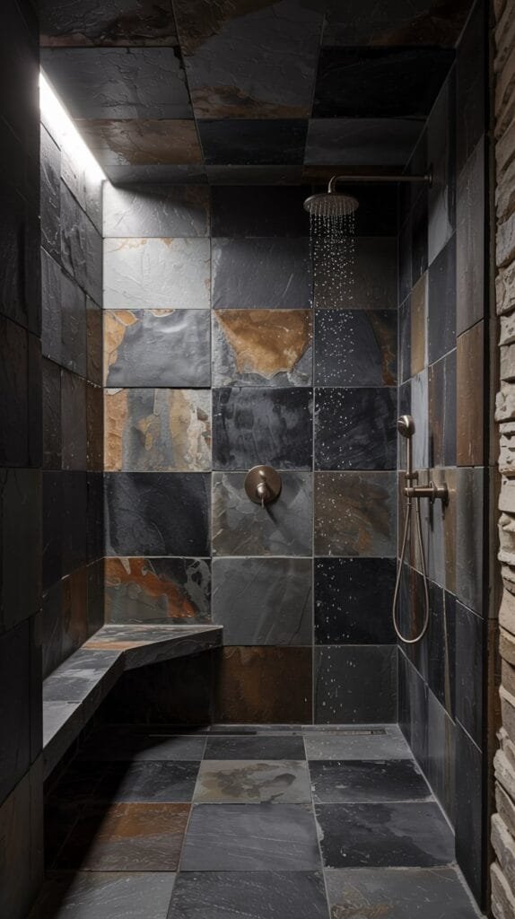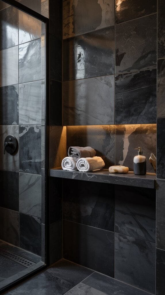 If you’re craving a spa-like retreat, go all in on texture. This black walk-in shower uses large matte slate tiles to create a dramatic, cocooning effect. Built-in bench seating adds function while keeping everything streamlined.