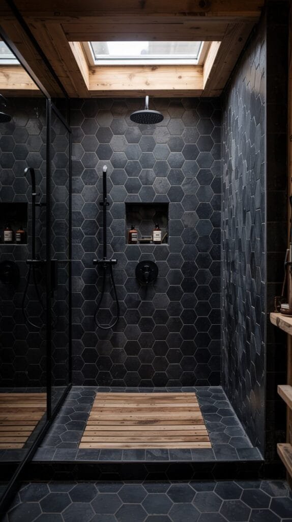 Matte black hex tiles steal the show in this minimalist walk-in shower. Natural light pours in from above, creating subtle highlights on the dark surface. A wooden slatted floor adds warmth and contrast, while the floating shelf keeps the look functional and sleek.