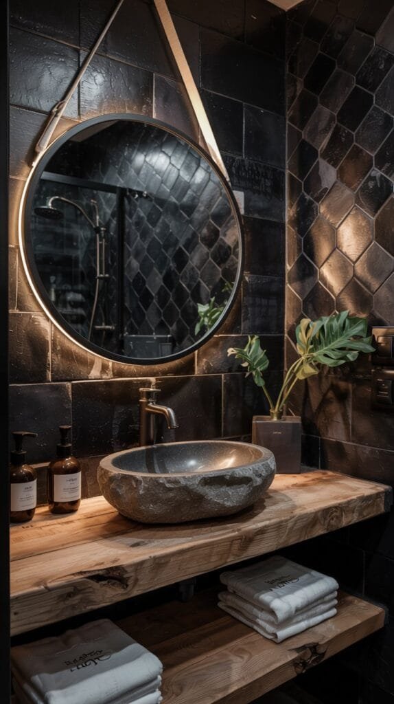 On the vanity side, a raw wood counter and round stone basin continue the theme of nature-meets-modern. With moody lighting and minimal decor, this design feels like a luxury retreat carved from shadow.