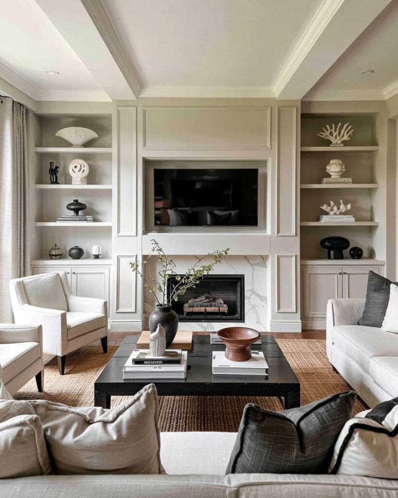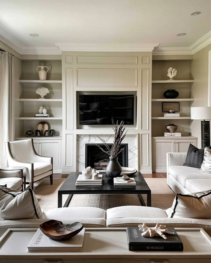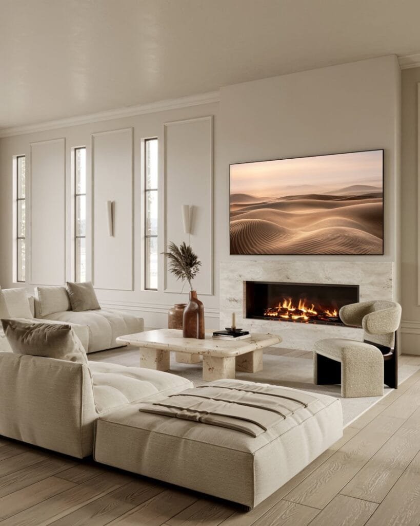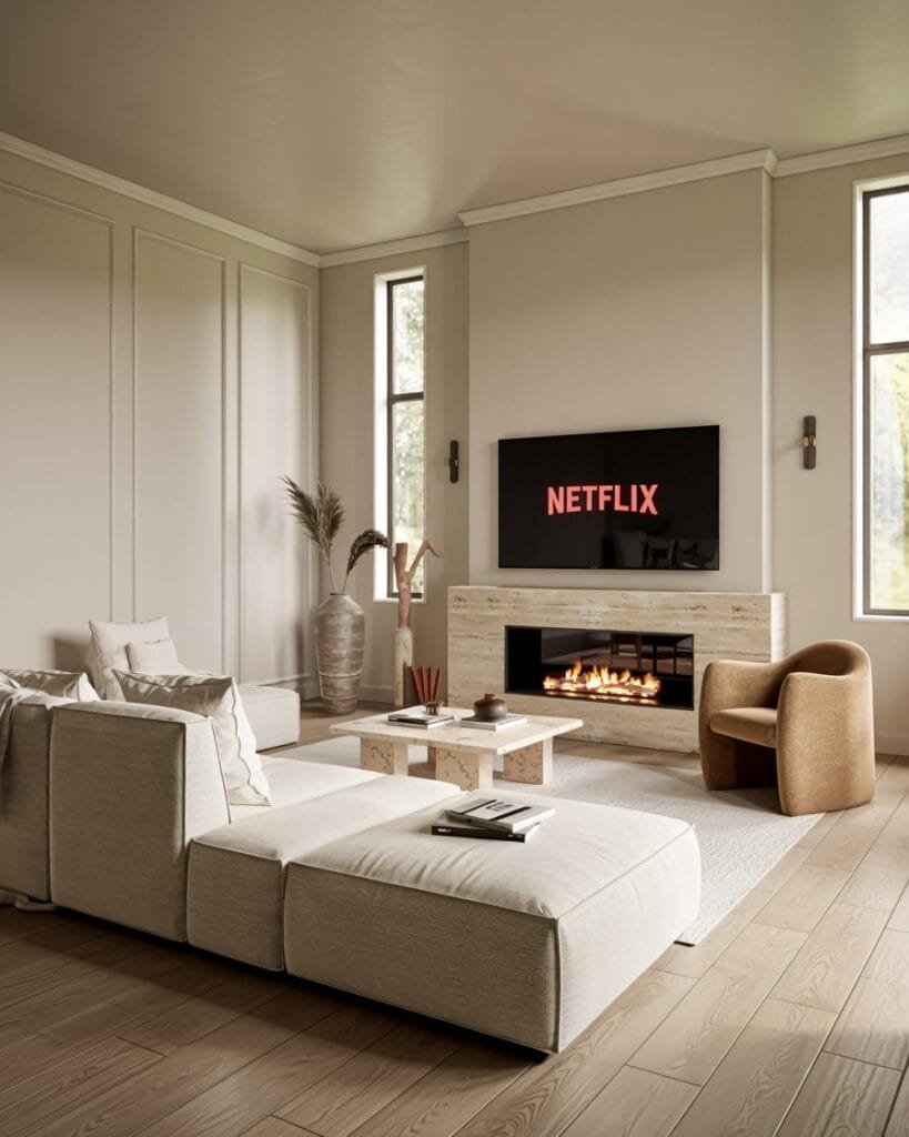 Nothing beats a neutral base when it comes to creating a calming, high-end feel. This refined look combines creamy tones, warm wood details, and subtle panel molding. Picture soft upholstery, a hint of gold in your fixtures, and a cozy fireplace — it’s simple, elegant, and quietly luxurious.