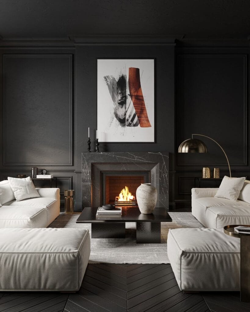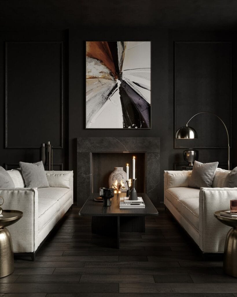 For those who lean into the dramatic, a moody modern classic living room delivers serious atmosphere. Rich charcoal or soft black walls make a bold statement while highlighting traditional elements like oversized art, vintage mirrors, and plush sofas.