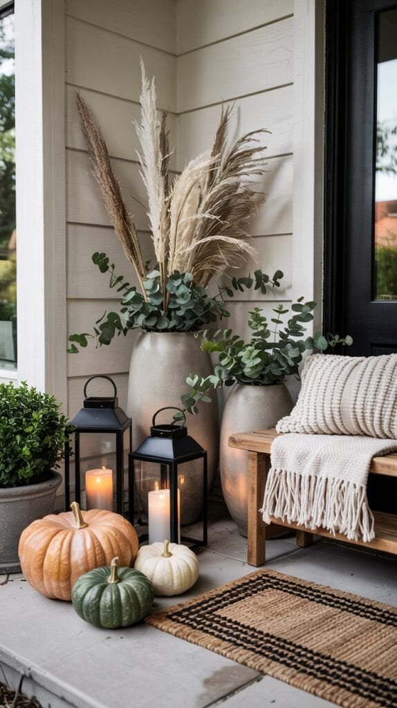 Start with the basics: a simple doormat swap, a pair of neutral lanterns, and a few pumpkins in varying sizes (bonus if they’re stone or ceramic — they last way longer too).