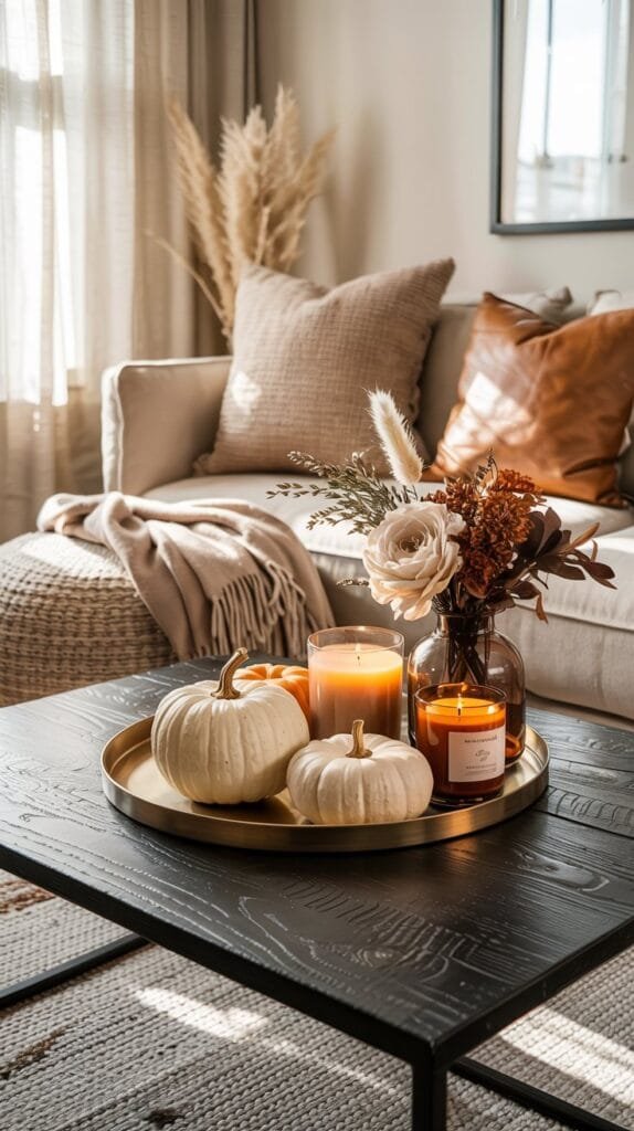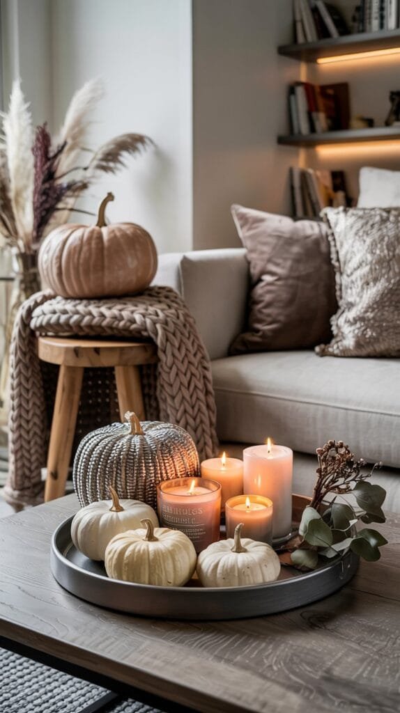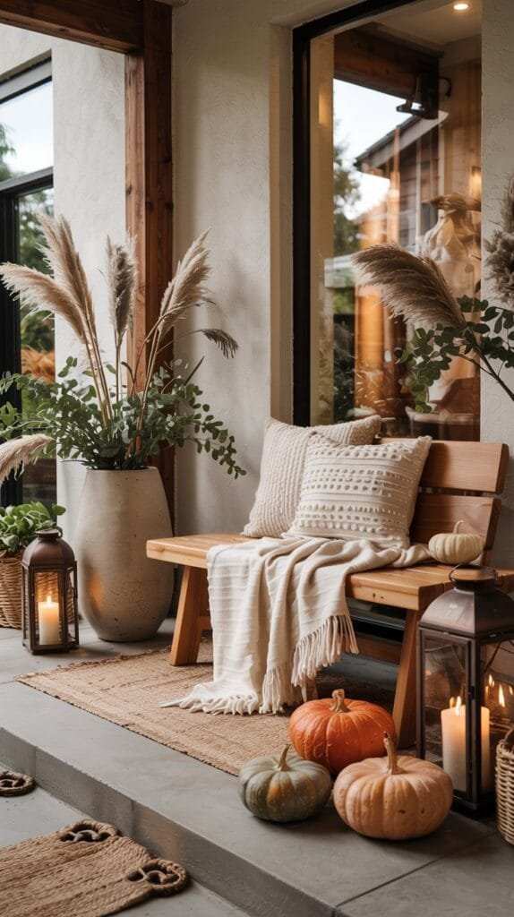 Layering is key here — think wool blankets, oversized textured cushions, and maybe even a neutral-toned pumpkin or two (yes, they exist, and no, they’re not tacky).