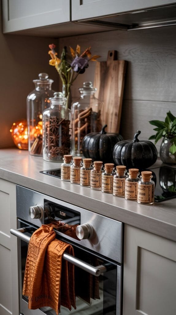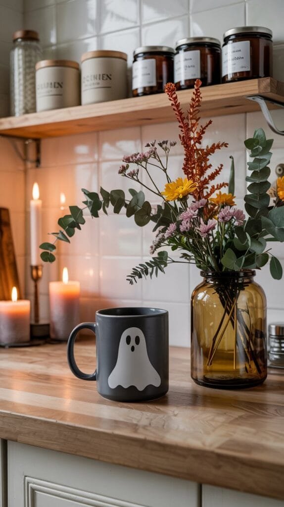 Mix in spooky glassware or apothecary jars for an edgy touch, and swap tea towels or candles for warm tones like burnt umber or olive. A ghost mug or two won’t hurt either 😉