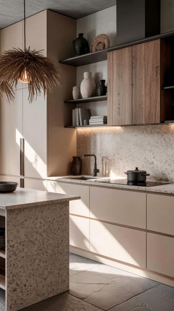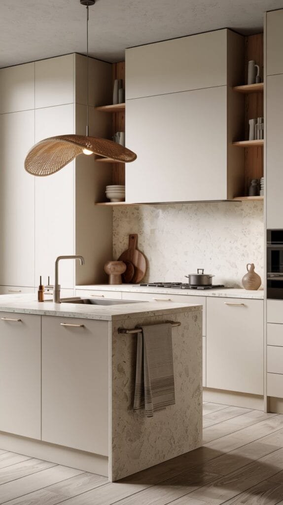 If you’re feeling the whole “soft minimalism” vibe, this one absolutely slaps. Think creamy beige cabinetry, white oak accents, and gently veined quartz countertops. It’s minimalist, but it still feels *human*—thanks to layered textures and warm organic tones.
