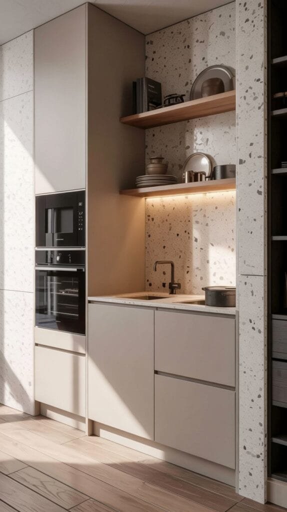 Try a terrazzo backsplash or microcement walls to add quiet drama. And don’t sleep on under-cabinet lighting—it makes a huge impact in small spaces. Want more outdoor inspiration? Head over to this Concrete Outdoor Kitchen Ideas post for complementary looks.