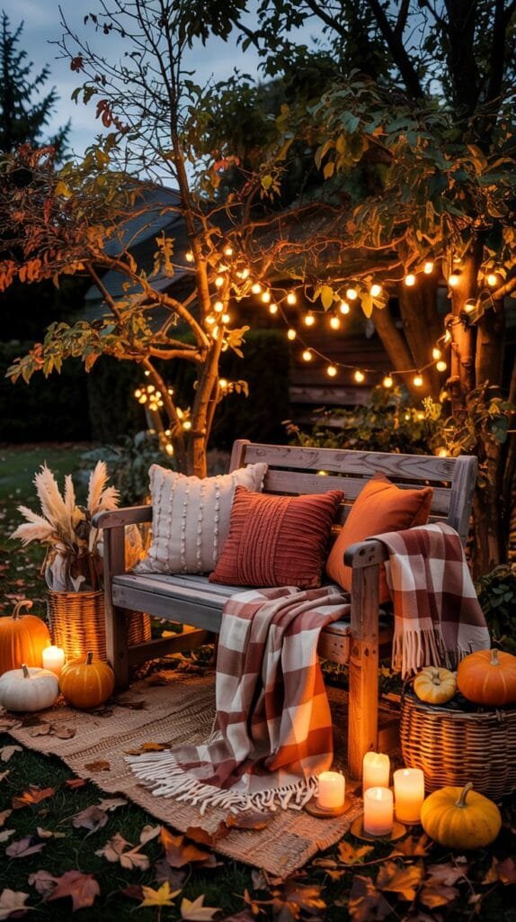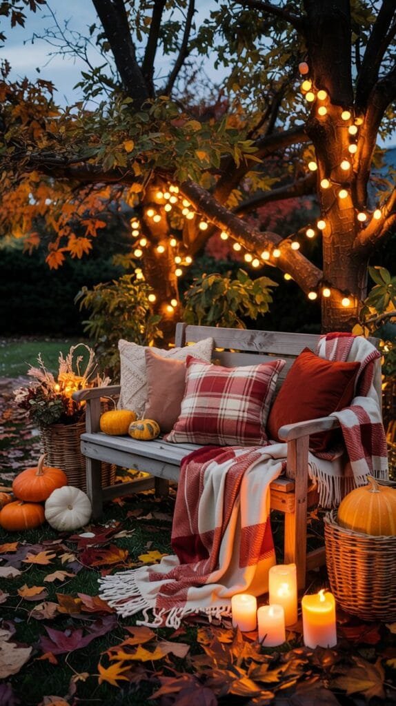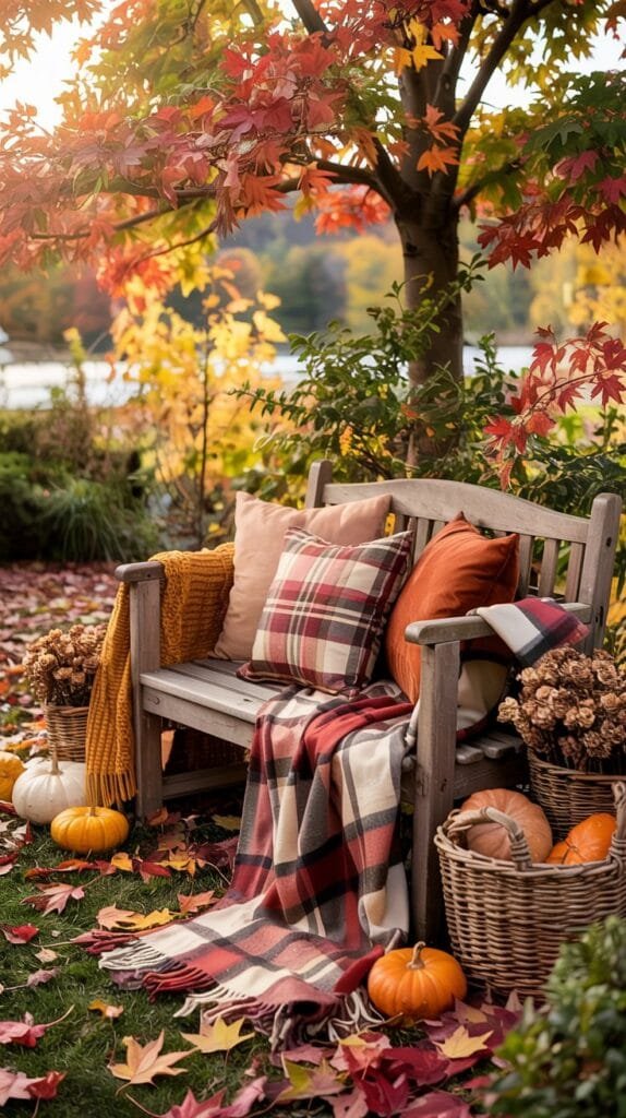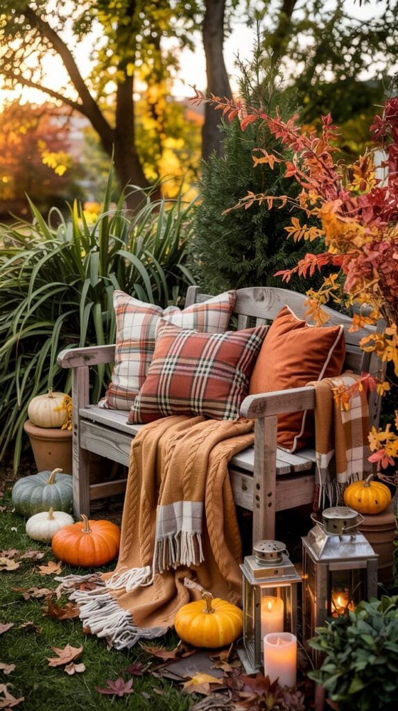 Garden Bench Nook with Fall Throws & Foliage