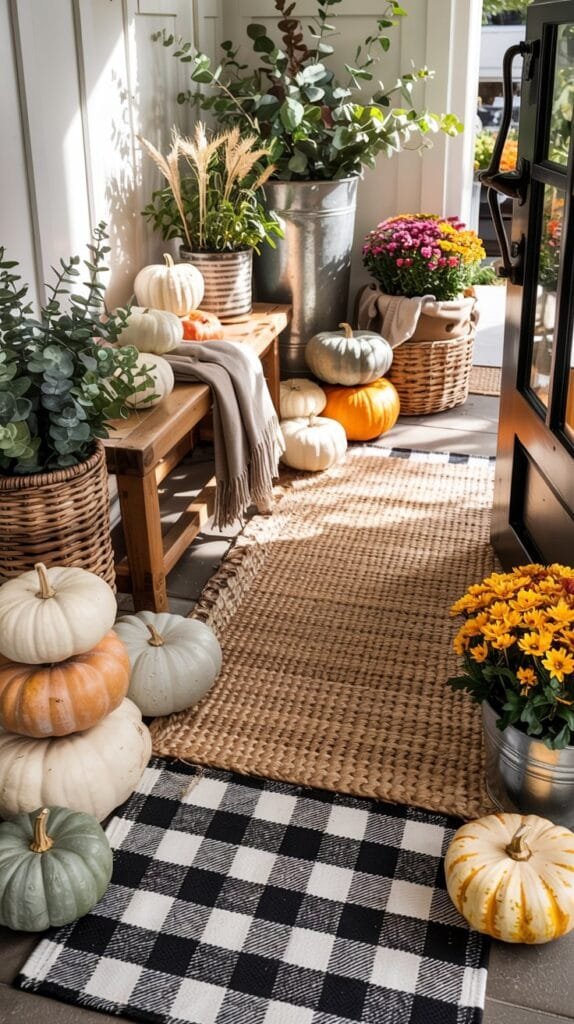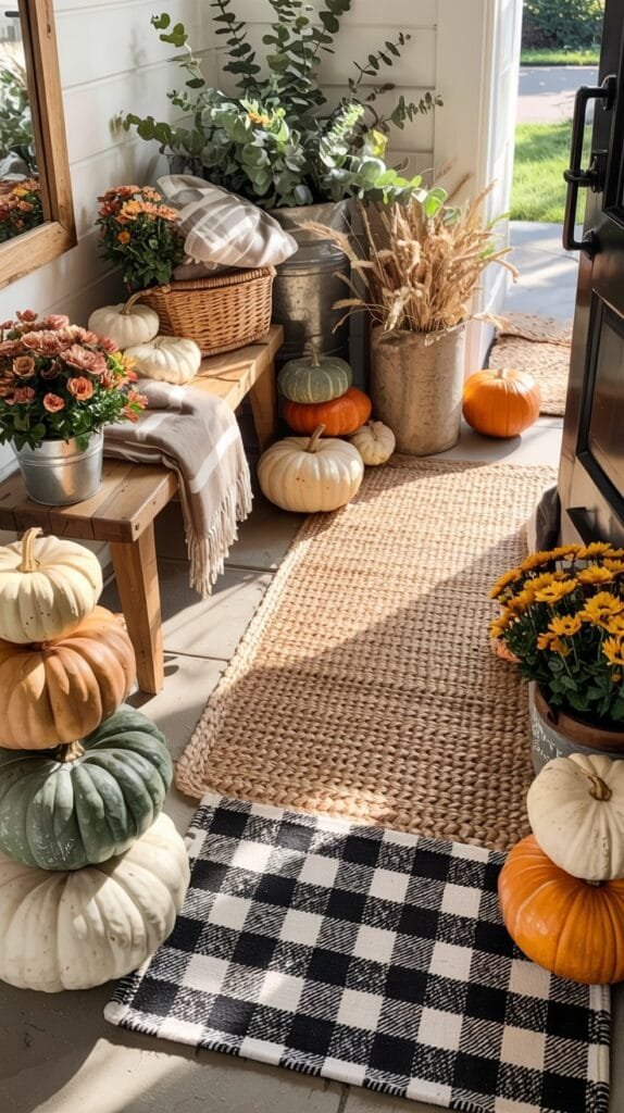 The mix of pattern and texture instantly makes your porch feel styled instead of bare, while perfectly framing your pumpkins, lanterns, and fall planters.