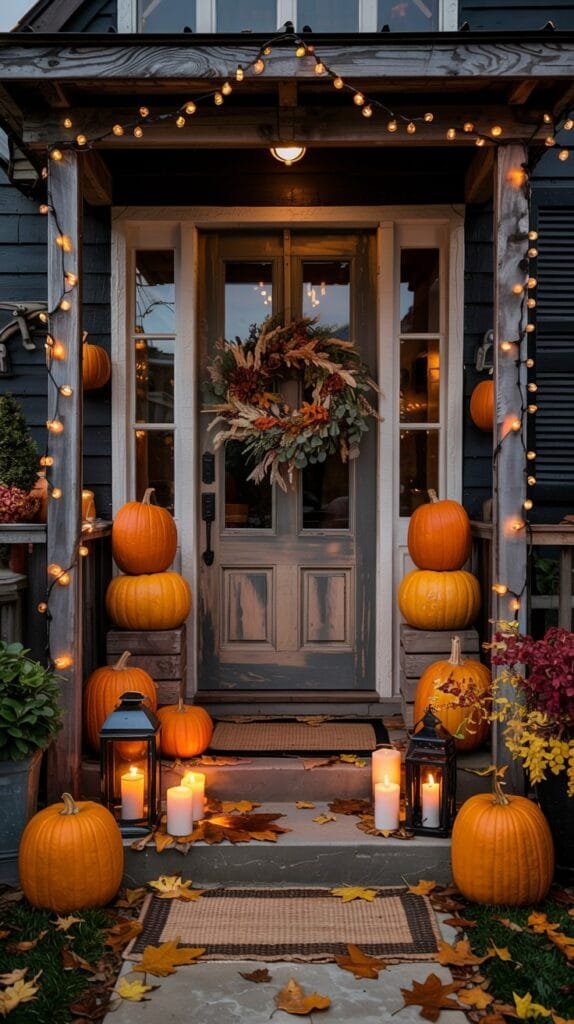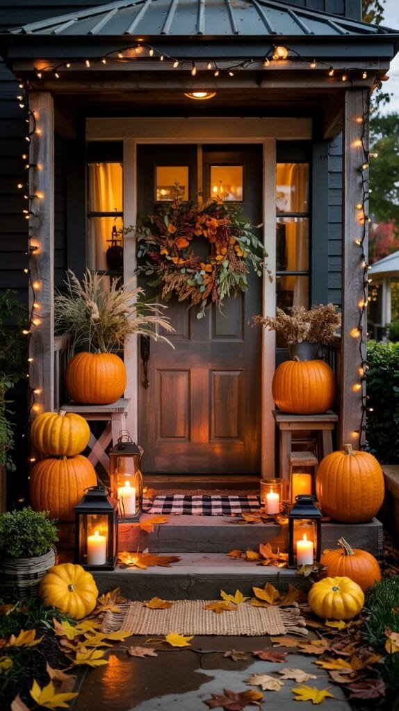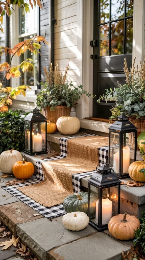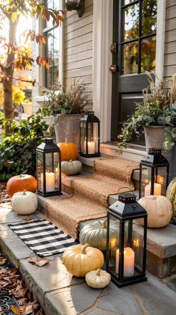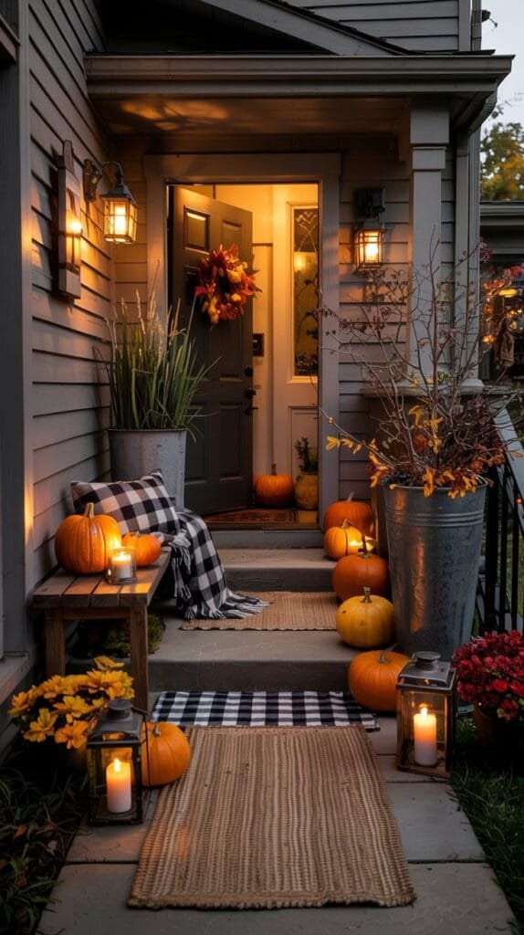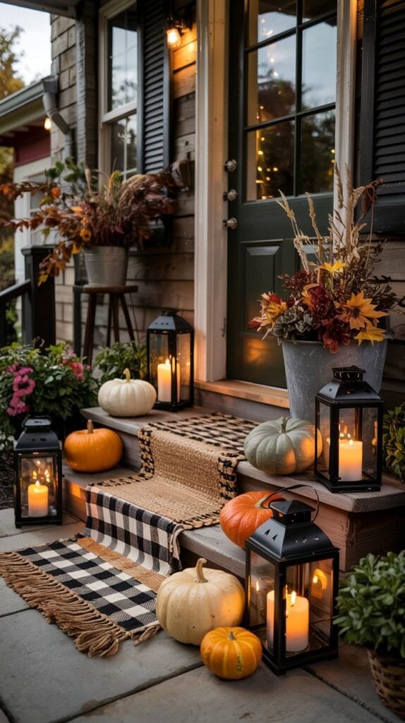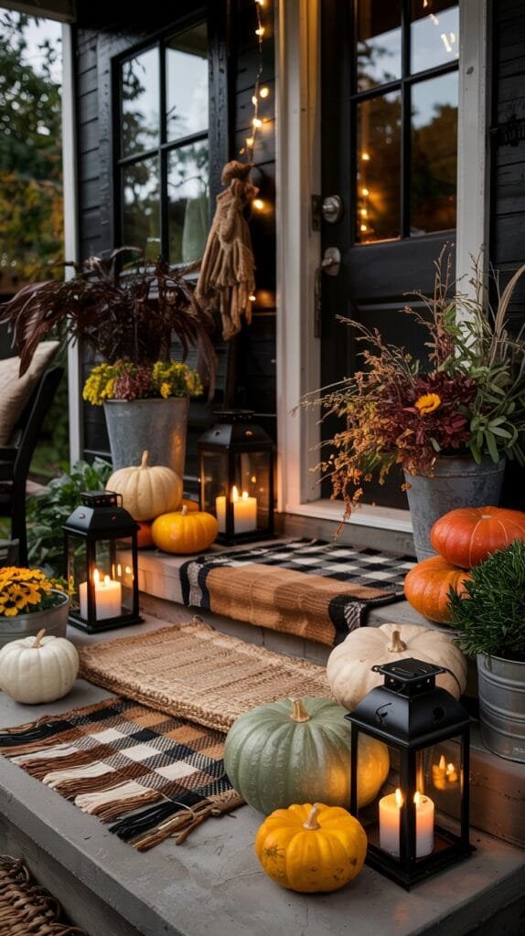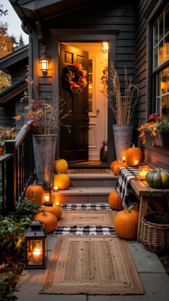 Outdoor spaces don’t need much to feel transformed in fall. A few pumpkins, a glowing lantern, a cozy throw and suddenly your porch feels like a seasonal storybook.