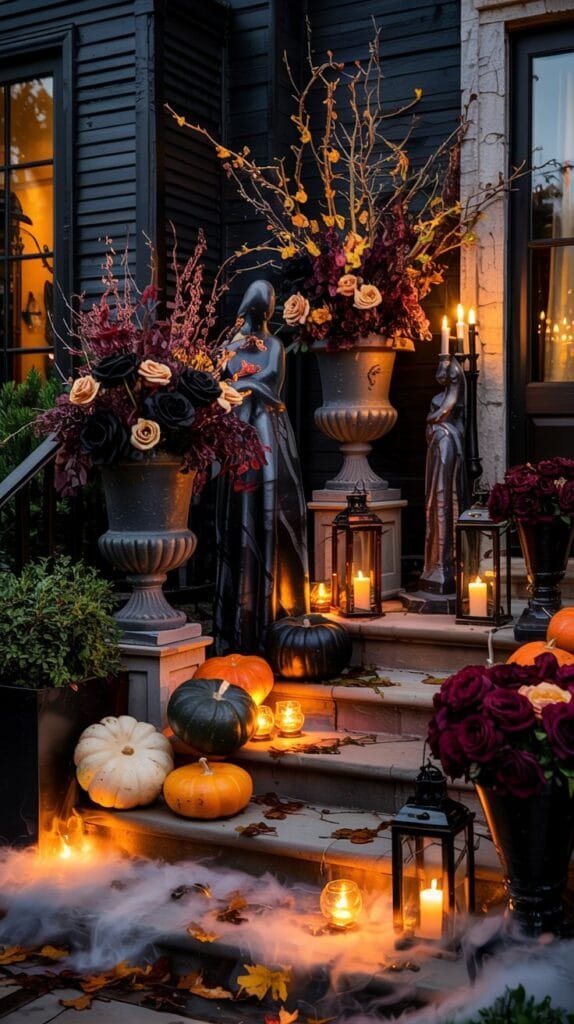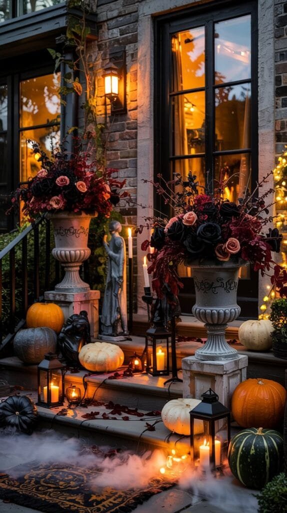 For Halloween, go chic instead of cheesy. Lean into gothic textures — velvet pumpkins, black taper candles, wrought-iron lanterns. Style oversized urns with dried florals in deep plum and smoky black for drama.
