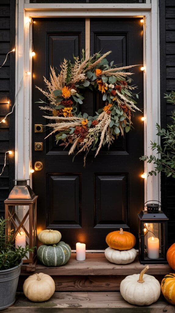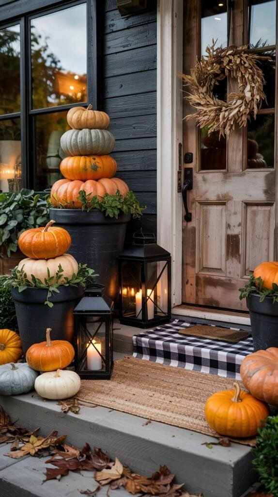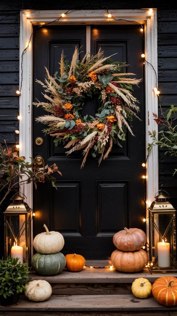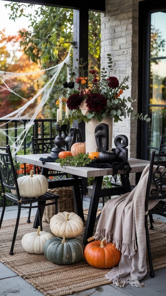 Skip the bright orange overload. Think muted heirloom pumpkins in soft greys, whites, and dusky greens, styled in sculptural clusters. Pair them with oversized black lanterns filled with flickering LED candles for a soft nighttime glow.