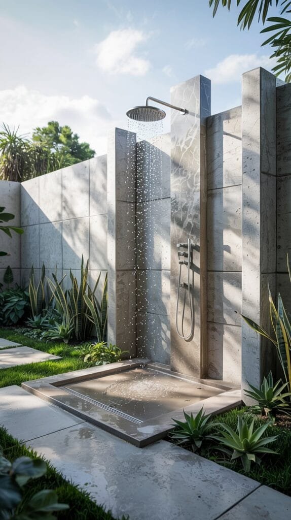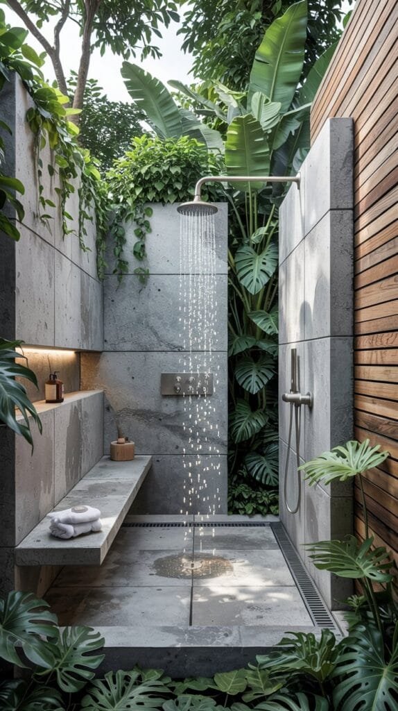 Tip: You can DIY a similar setup by using cement-look tiles and a simple outdoor plumbing kit instead of building an entire concrete enclosure. A weatherproof wooden bench completes the spa vibe.