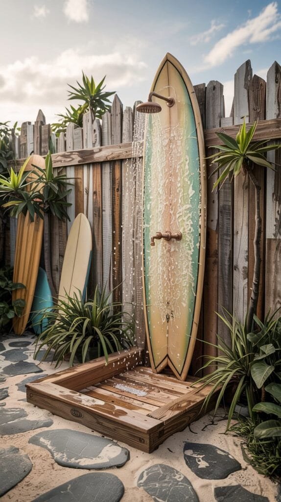 Style it up: Hang a canvas tote nearby for beach gear, and store natural soaps in a vintage crate. If you’re feeling crafty, you can build the enclosure from salvaged pallet wood and seal it with marine-grade varnish.