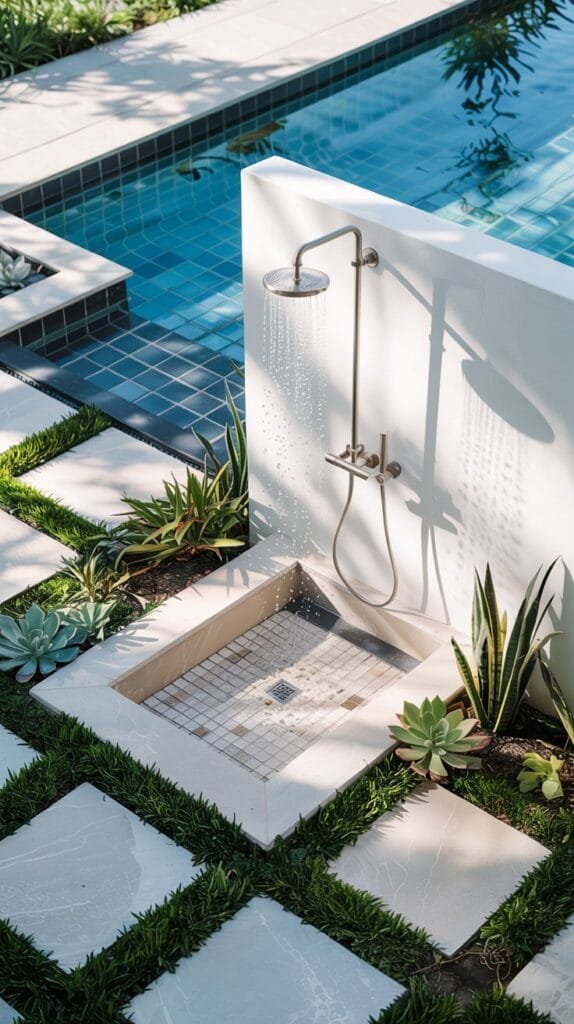 This one is perfect if you already have a pool or are dreaming about installing one. A minimal shower area in smooth white render with a simple chrome fixture looks clean and timeless. Tuck it beside the pool steps so everyone can rinse off easily.