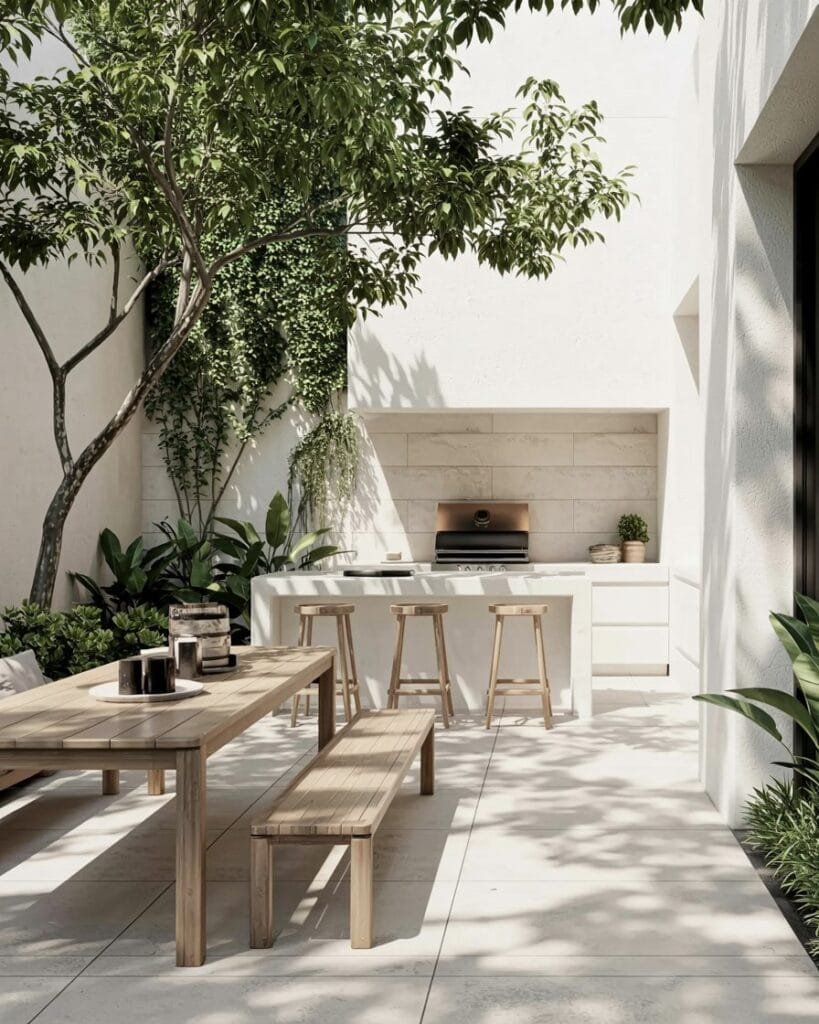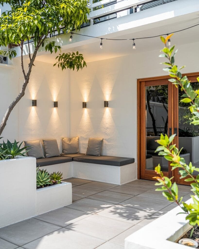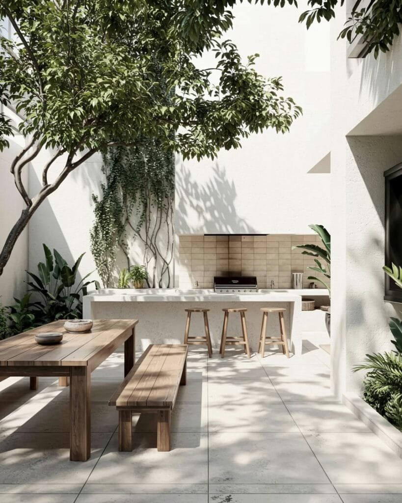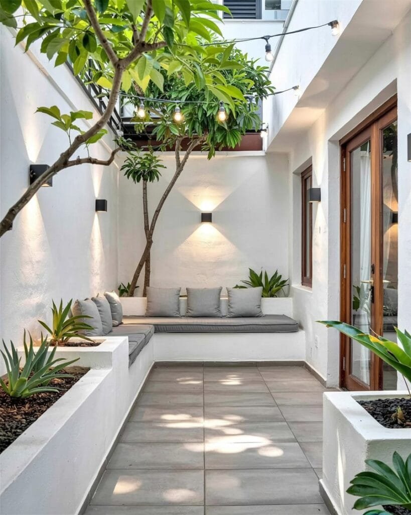 The best courtyard design is minimal but never flat — play with plaster walls that catch the light, floor lanterns, and an indoor garden moment like potted olive trees or sculptural cacti.