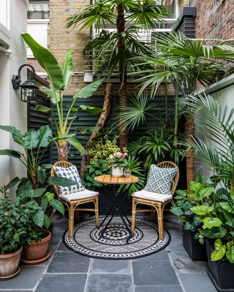 Play with terrace decor that nods to interiors — ceramic lamps, woven poufs, even a stack of oversized books. Mix that with nature creeping in, like ivy across plaster walls or a row of tall palms in ceramic planters.