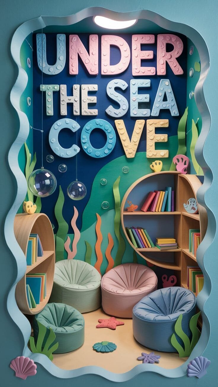 Create a whale tail reading bench with a simple curved back or draped fabric, and tuck beanbags into a “coral reef” zone with coral-shaped cushions. Hang a net from the ceiling with laminated fish that feature student book reviews.