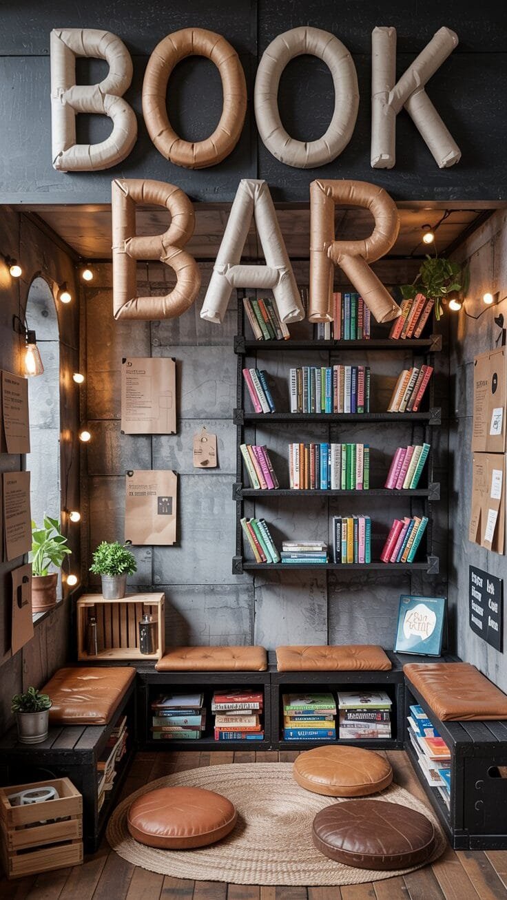 Set up a “Book Bar” counter with stools and a menu board listing genres and “flavors” (mood-based picks). Add cork tiles with minimalist posters for clean, stylish inspiration.