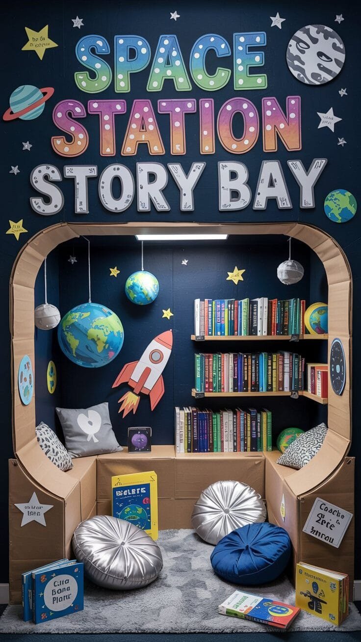 Build a semi-circular command bench with silver cushions and a pegboard “control panel” displaying book series. A fiber-optic lamp or galaxy projector adds drama without distracting students.
