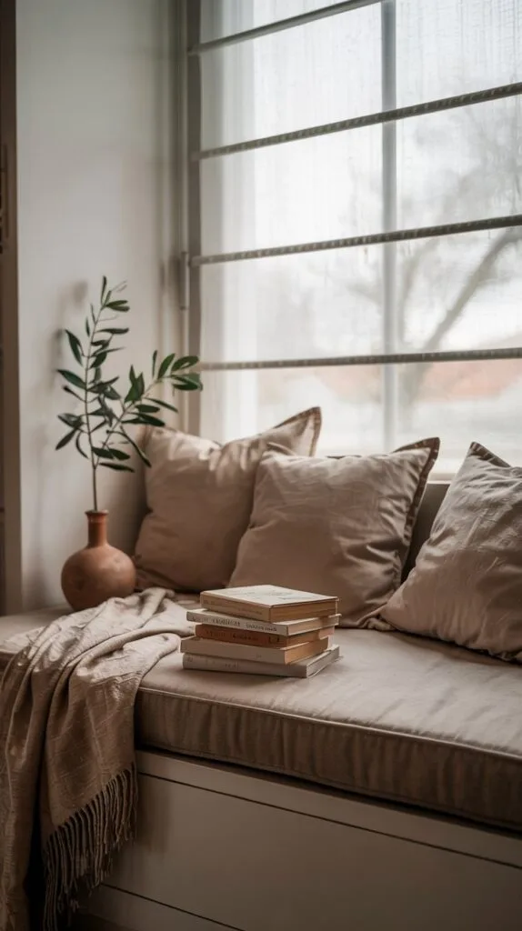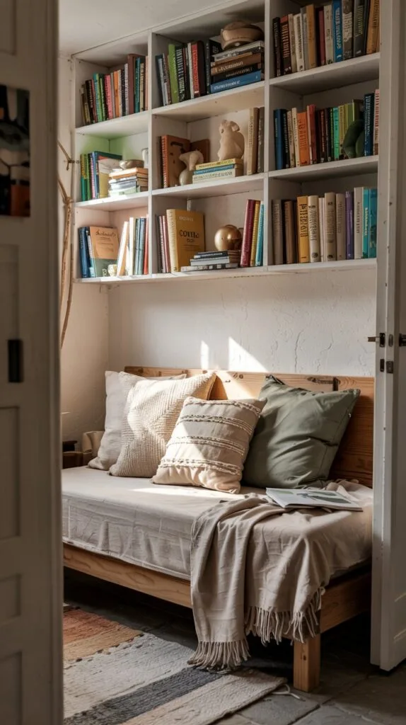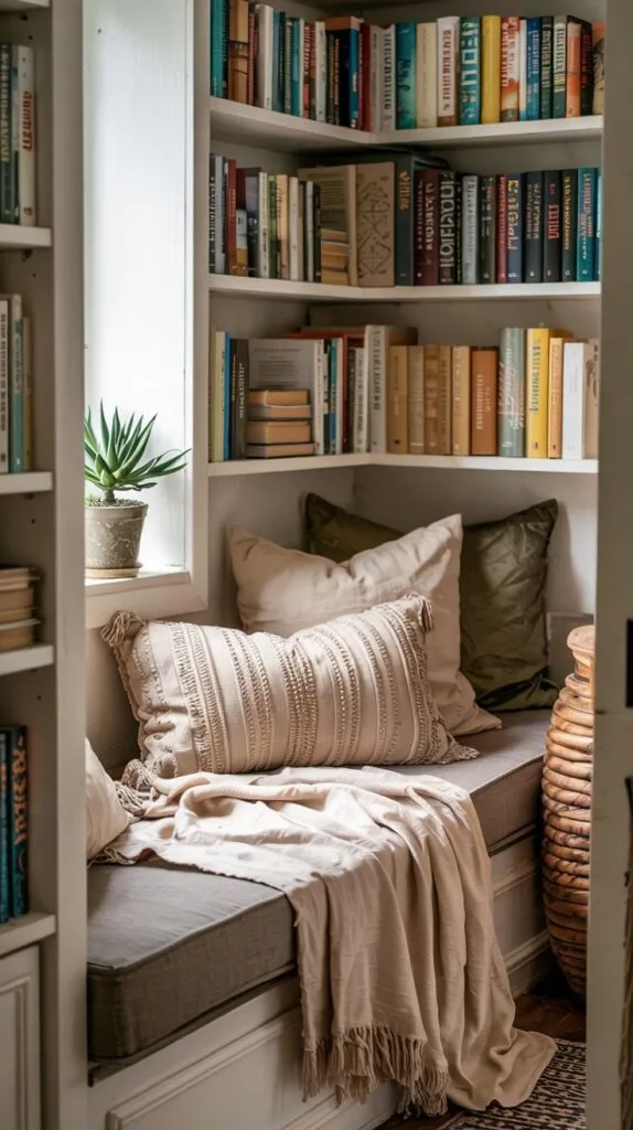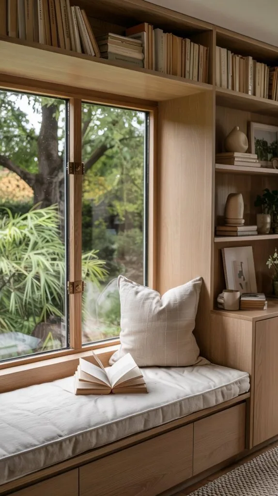 If you’ve got a bay window or even just a deep sill, you’re halfway to a dreamy reading spot. Add a cushion, a few throw pillows, and shelves built into either side for your TBR pile.