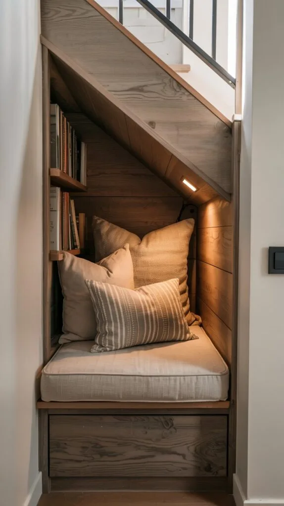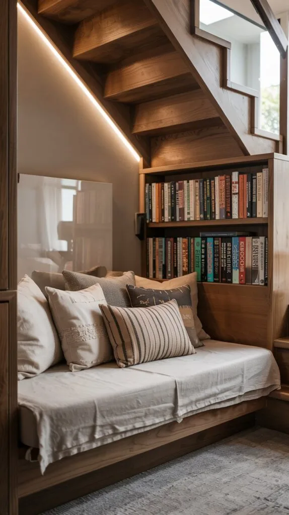 That awkward space under the stairs? Turn it into a snug little adult hideout.