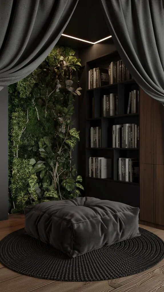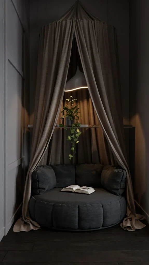 Add a hanging canopy or mosquito net to any corner, toss in a floor cushion and a few pillows, and you’ve created an adult reading cave. It’s like a blanket fort—but legal and Pinterest-worthy.