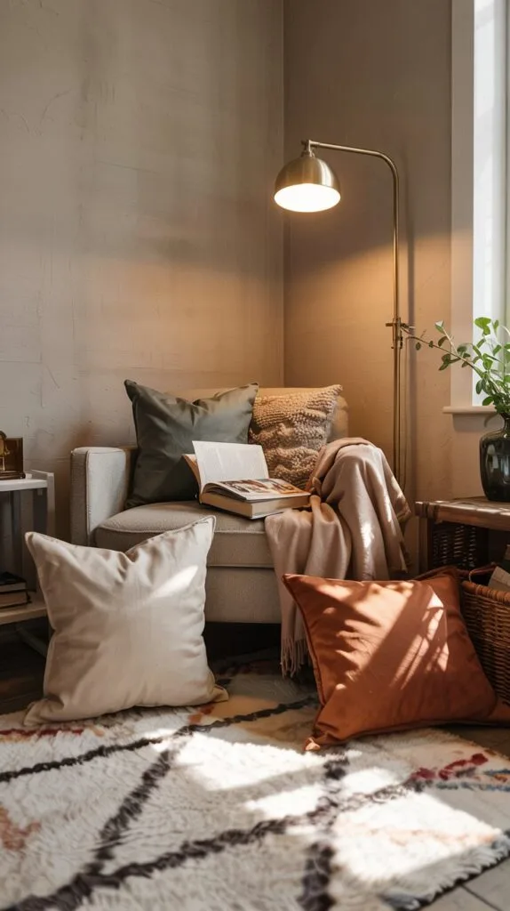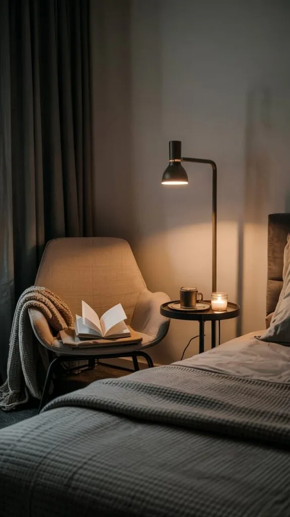 This is the holy grail of quick reading nook ideas: one oversized chair + one soft-glow lamp = adult reading goals.