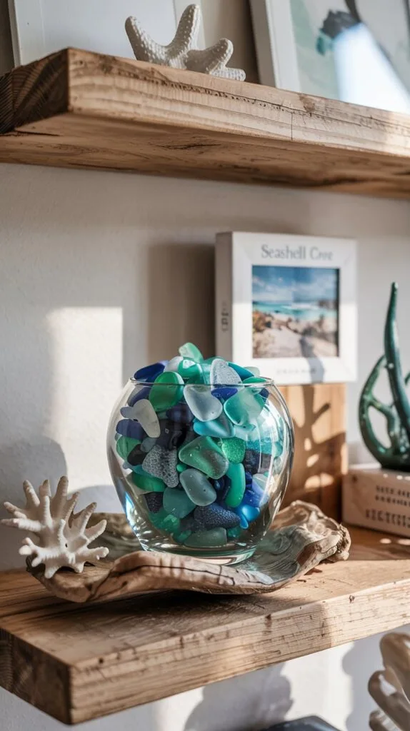 Shells, coral, and glass floats add tiny reminders of the coast without feeling kitschy.