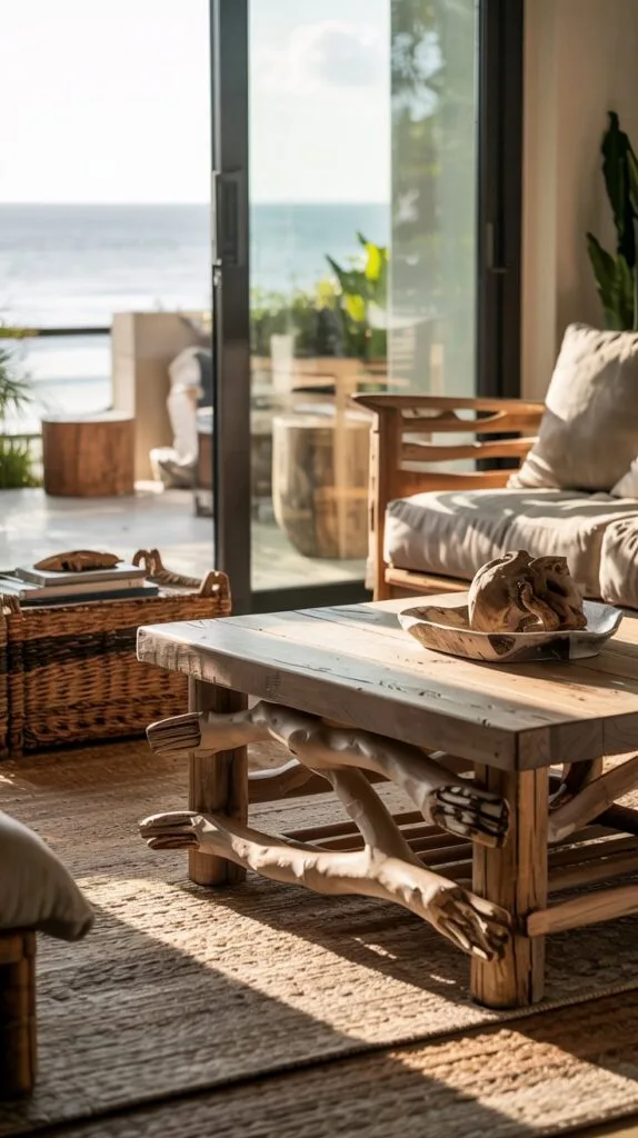 A driftwood mirror or reclaimed wood coffee table grounds your space with rustic warmth.