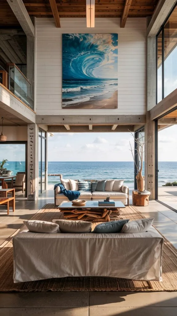 Oversized ocean photography, watercolor seascapes, or abstract blues turn any wall into a statement.