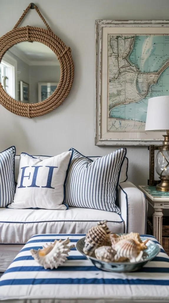 A rope lamp, lantern, or even a subtle navy stripe nods to sailing culture without going full theme park.