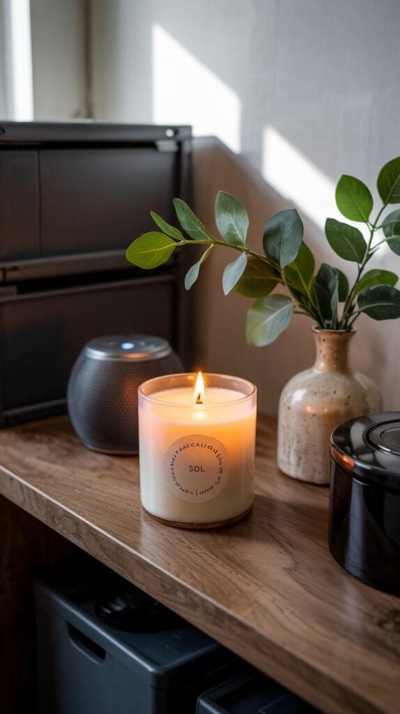 A clean cedar or leather-scented diffuser completely changes the energy of a small garage.