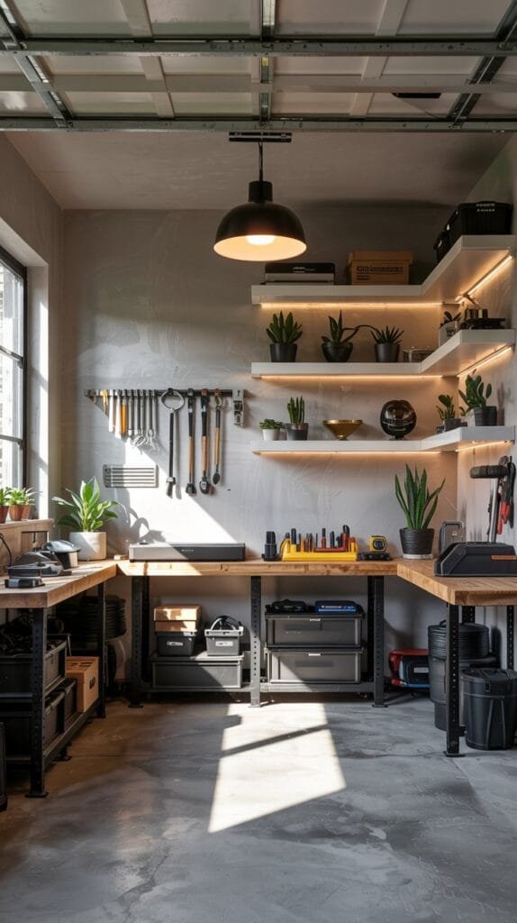 Even a slim LED strip behind shelving can make tools and decor pop like an art installation.
