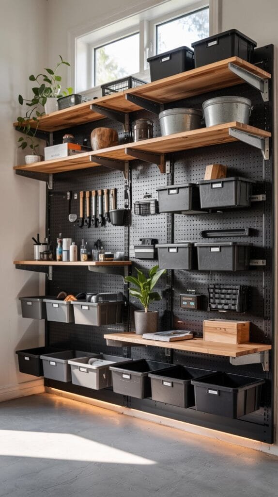 Build upward — matte black pegboards, floating shelves, or a slim slatwall system.