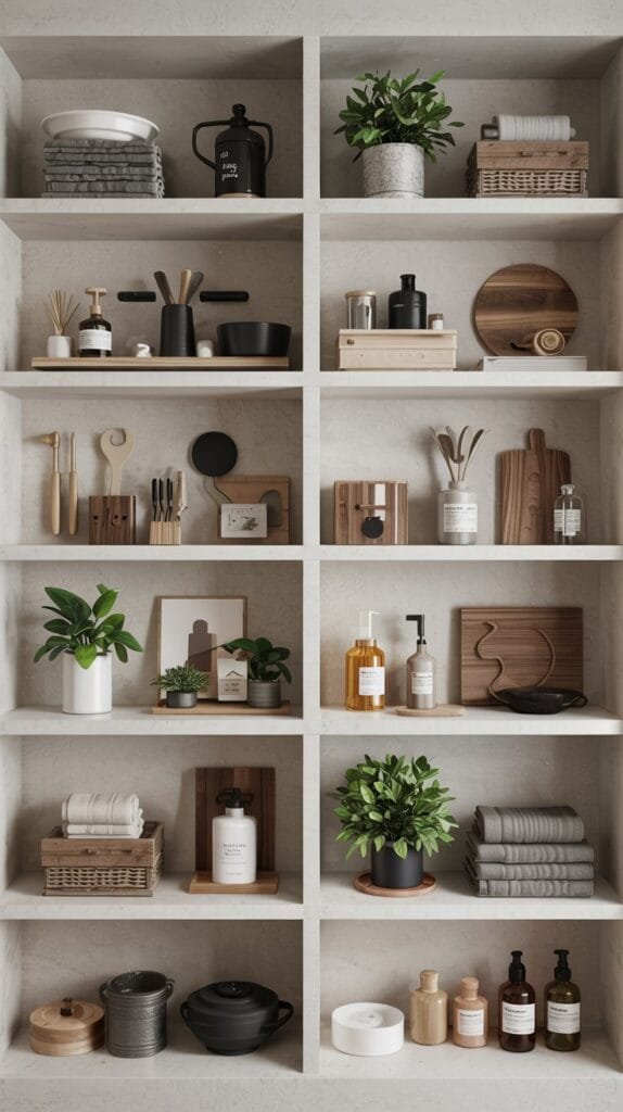 Use matching containers (black, white, or wood-toned) so it feels cohesive rather than cluttered.