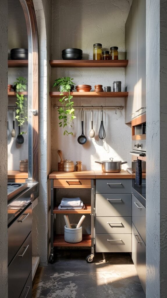 And a small rolling cart tucked into a corner? Instant extra surface and tiny storage heaven. It’s about making every object earn its place.